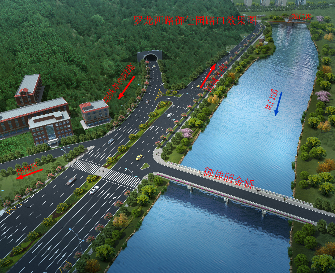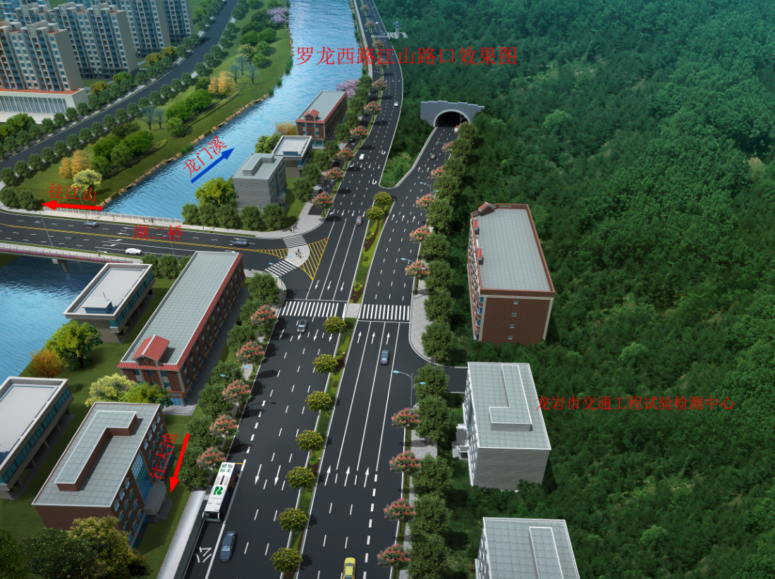 羅龍西路是連接龍巖西高速出入口與中心城市的唯一通道,其規(guī)劃改造范圍從紅竹山橋至御佳園路口,全長3855米,計劃將原道路拓寬至40米,實行雙向六車道,兩旁設(shè)2.5米非機(jī)動車道,并在湖二橋路口以東設(shè)640米入城單向三車道隧道連接至御佳園路口,原羅龍西路湖二橋至御佳園段將調(diào)整為出城單向車道。