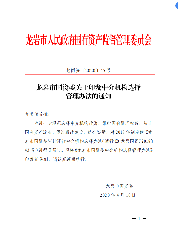 龍巖市國資委關(guān)于印發(fā)中介機(jī)構(gòu)選擇管理辦法的通知(龍國資[2020]45號)